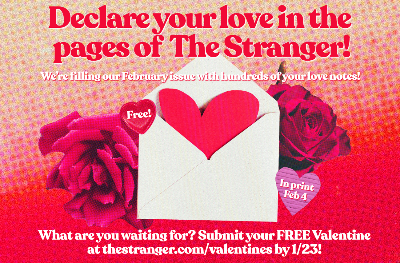 Just head over to thestranger.com/valentines and spill your heart in 150 characters or less. Then, when our next issue hits the stands on February 4, your crush can pore over a (real! made-of-paper!) copy of The Stranger at their favorite coffeeshop on a chilly afternoon, find your sweet message, cut it out, laminate it with a piece of Scotch tape, and carry it around in their wallet like it’s 1998!