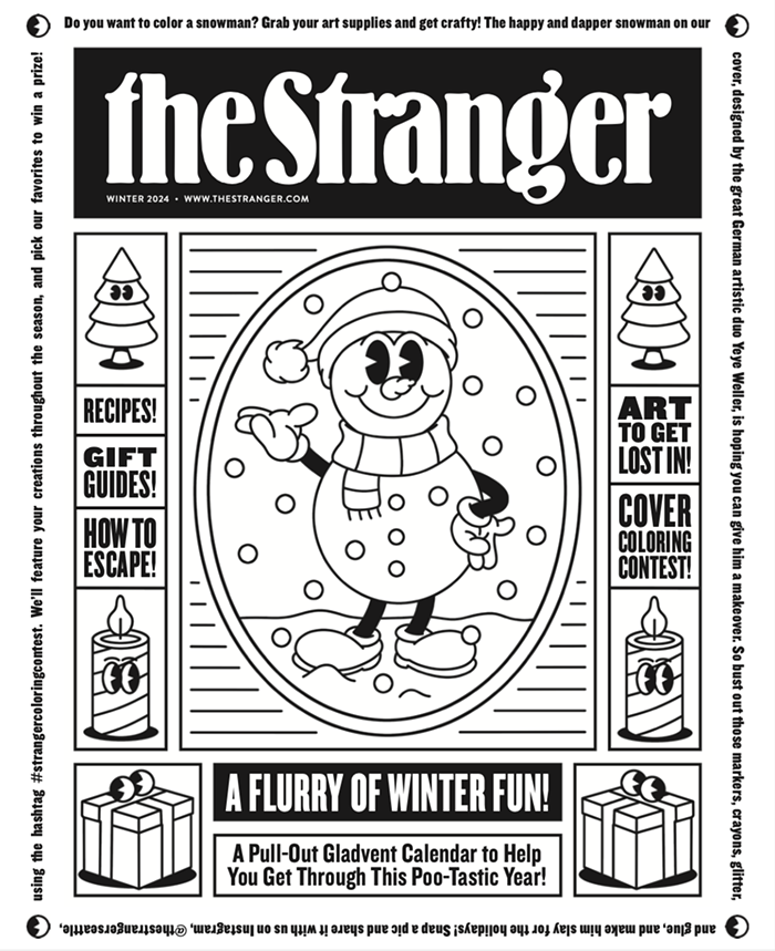 The happy and dapper snowman on our cover, designed by the great German artistic duo Yeye Weller, is hoping you can give him a makeover. So bust out those markers, crayons, glitter, and glue, and make him slay for the holidays!